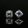 ピアス全体の大きさは約7.5×7.5mm。無色透明のラウンドブリリアントカットとエメラルドカットが、サファイアブルーのプリンセスカットを囲むように